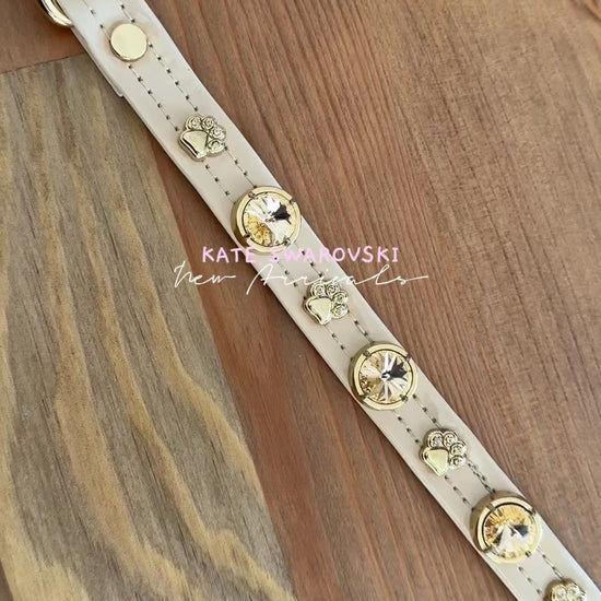 Sütlü Kahve vegan dostu parıltılı deri üzerine parıldayan topaz renkli orjinal Swarovski kristalleri ve altın kaplama minik patiler ile zarif bir şekilde süslenmiştir. Bu tasma, hem günlük kullanım için mükemmel bir seçenek sunarken hem de özel günlerde köpeğinizin stilini tamamlamak için benzersiz bir aksesuar olacaktır. Aynı renkteki vegan dostu deri ve Swarovski taşlar içeren gezdirme kayışı ile köpeğinizin görünümünü tamamlayabilirsiniz.