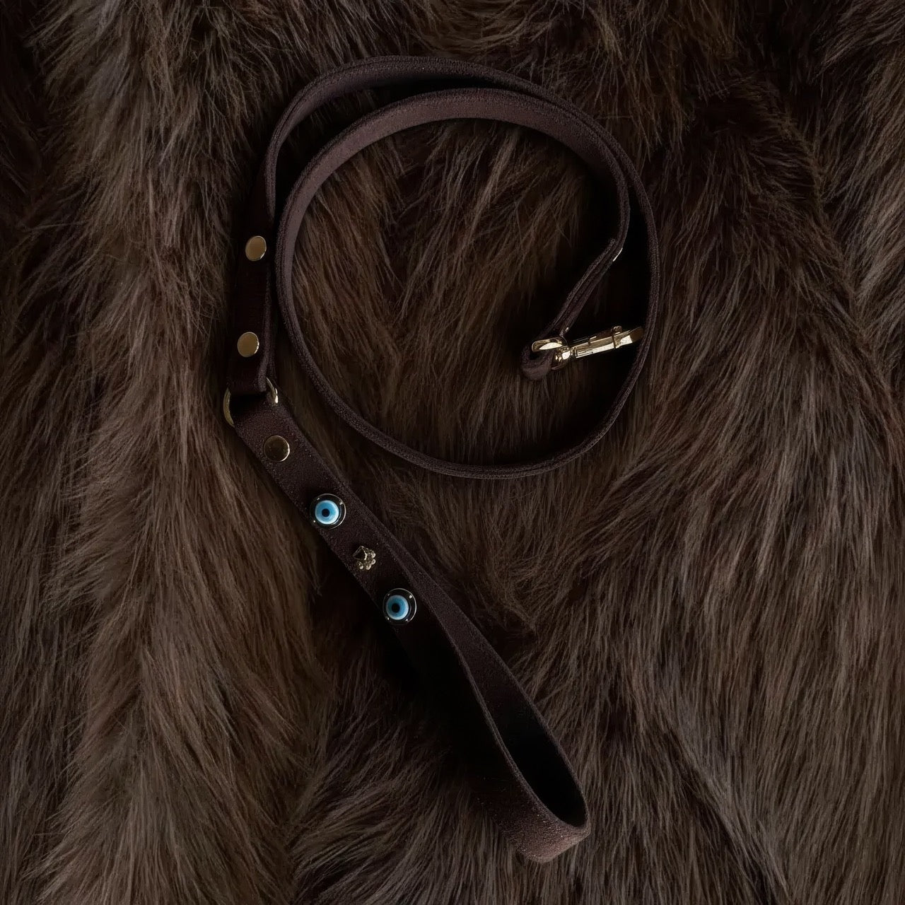 Yumuşak Süet vegan deri üzerine, özel teknikle monte edilmiş altın kaplama yuvalara yerleştirilmiş cam nazar boncukları ve mini patilerle süslendi.
