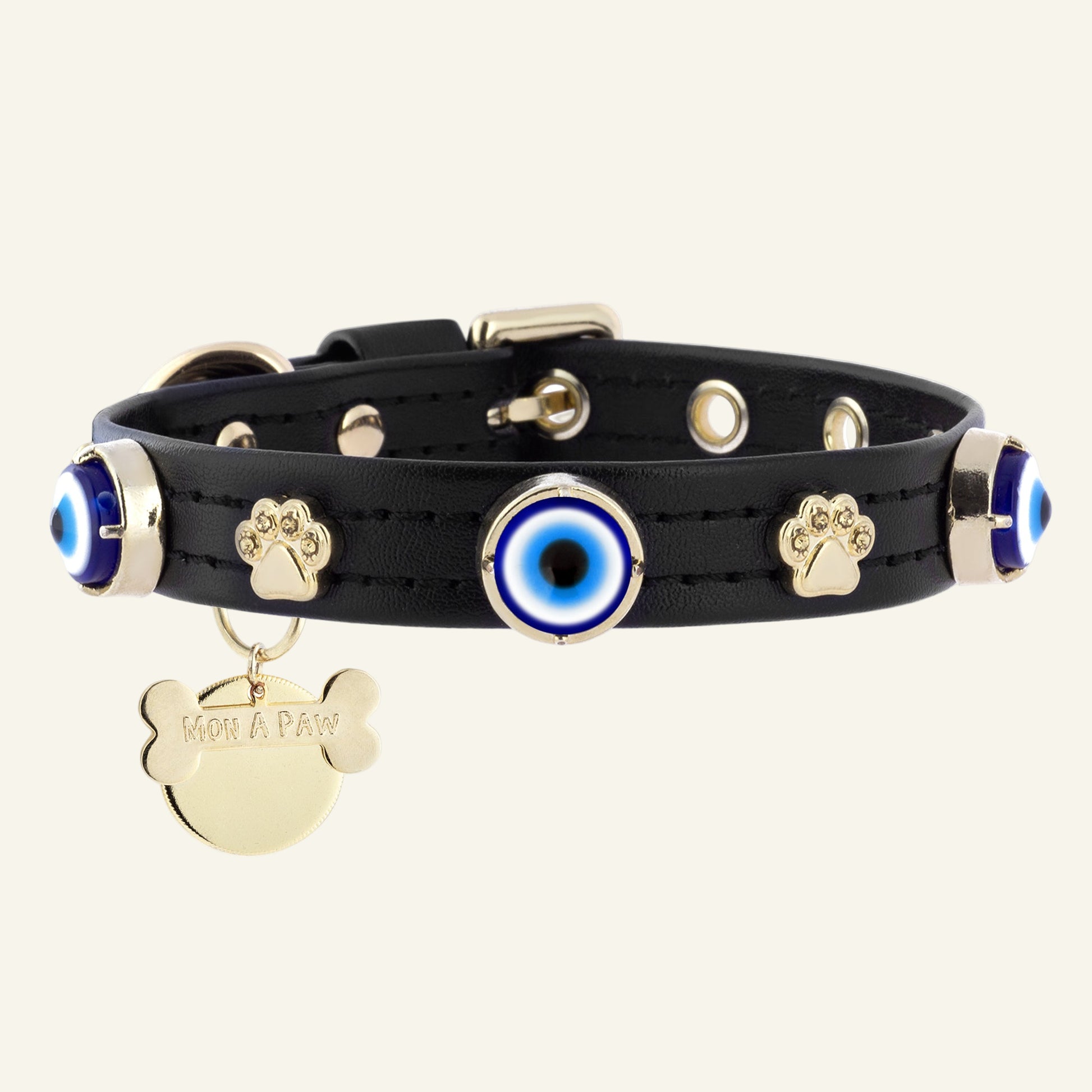 Mat Yumuşak vegan deri üzerine, özel teknikle monte edilmiş altın kaplama yuvalara yerleştirilmiş cam nazar boncukları ve mini patilerle süslendi.