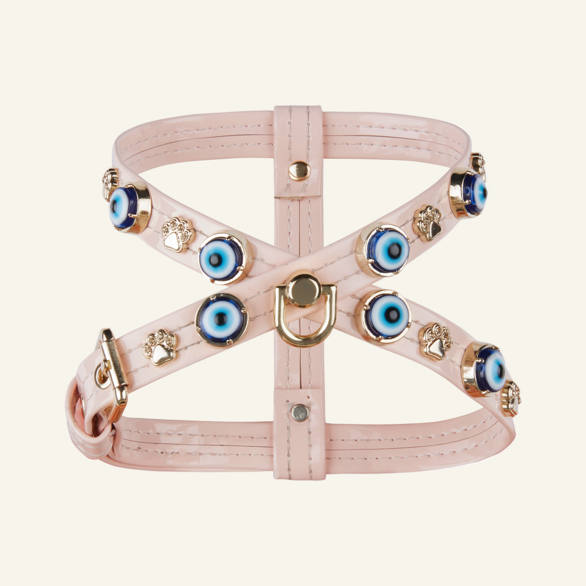 Parlak Toz Pembe vegan dostu faux deri üzerine cam nazar boncukları ve altın kaplama minik patiler ile zarif bir şekilde süslenmiştir. Bu Harness, hem günlük kullanım için mükemmel bir seçenek sunarken hem de özel günlerde köpeğinizin stilini tamamlamak için benzersiz bir aksesuar olacaktır. Aynı renkteki nazar boncukları ile bezenmiş gezdirme kayışı ile köpeğinizin görünümünü tamamlayabilirsiniz.